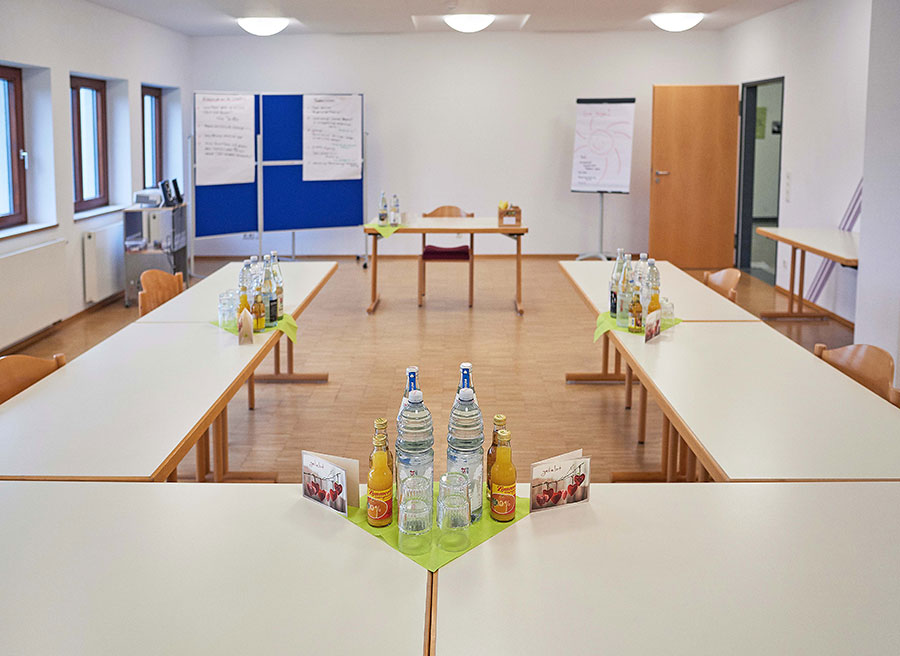Der helle Seminarraum 3 bietet vor allem für kleinere Tagungen in U-Form oder für Gruppierungen im Stuhlkreis ideale Bedingungen durch die weite Fensterfront. Gerne wird der Raum auch für Entspannungs- und Yogaeinheiten genutzt, da er sehr ruhig liegt und die passende Größe für eine kleine bis mittlere Gruppe hat.