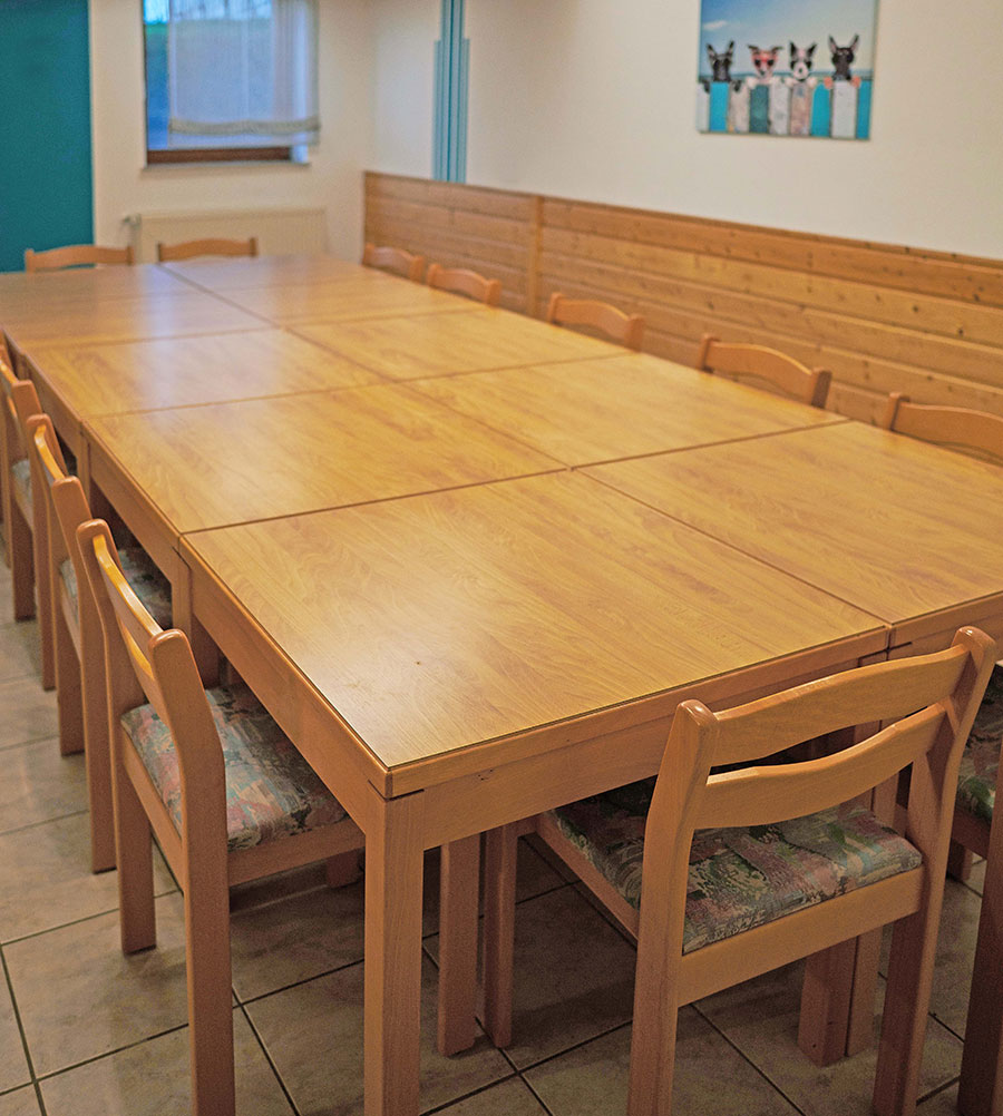 Der Raum wird gerne als zusätzlicher Gruppenraum genutzt. Eine Verbindungstür grenzt direkt an den Werkraum im 2. Untergeschoss. Beide Räume können gemeinsam genutzt werden, um im einen Bereich inhaltlich und im anderen Raum kreativ zu arbeiten.